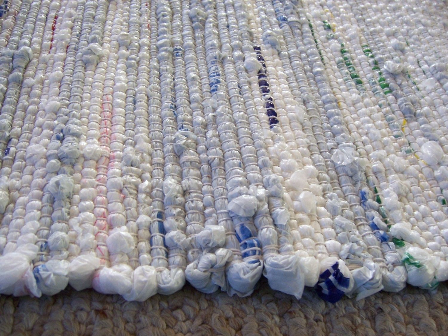 Plastic bags/clothing can be woven together to make a mat/outdoor rug!